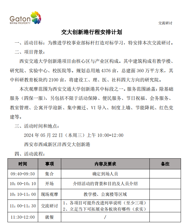 為進(jìn)一步提升高校業(yè)態(tài)管理水平,拓寬項(xiàng)目管理人員工作思路,學(xué)習(xí)標(biāo)桿企業(yè)的優(yōu)秀做法和先進(jìn)經(jīng)驗(yàn)。5月23日,西安錦天物業(yè)管理服務(wù)有限公司學(xué)校事業(yè)部骨干成員在事業(yè)部總監(jiān)白帆先生的帶領(lǐng)下來(lái)到金地物業(yè)服務(wù)管理的交大創(chuàng)新港項(xiàng)目進(jìn)行對(duì)標(biāo)學(xué)習(xí)。